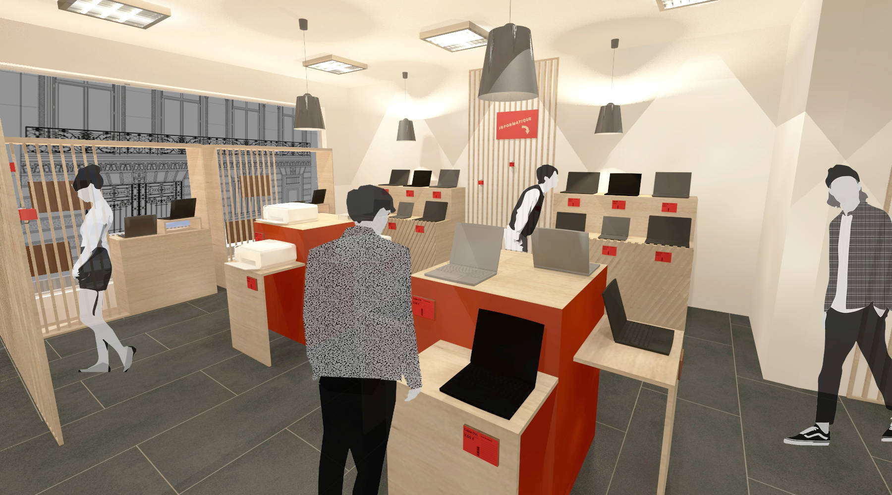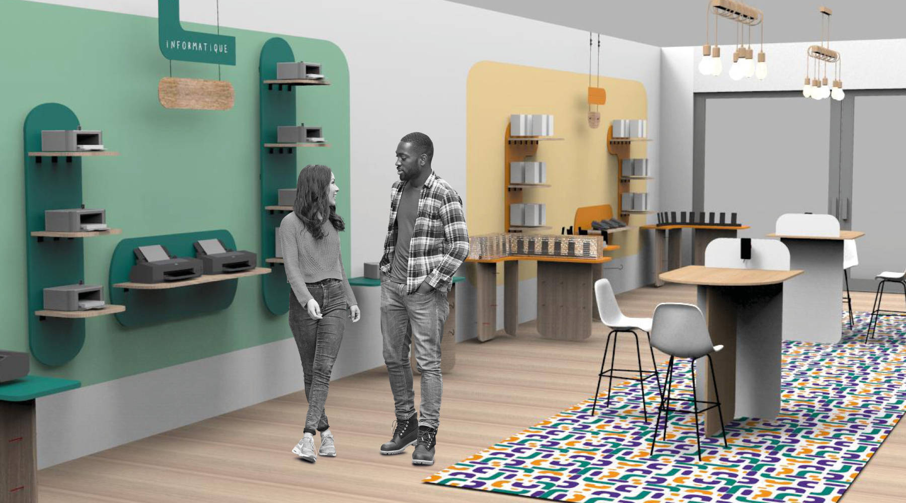 Les étudiants de DSAA DESIGN Éco-responsable étaient engagés dans leur premier projet de design global d’envergure pour Les Ateliers du Bocage. Cette entreprise de l’économie circulaire est, entre autres activités, spécialisée dans la collecte, le reconditionnement et le réemploi de matériel informatique et téléphonique. Le projet consistait à concevoir un principe d’aménagement pour leurs boutiques de vente/réparation. L’objectif est de générer une nouvelle identité et de nouveaux aménagements reflétant les valeurs des Ateliers du Bocage en élaborant des solutions adaptables à des espaces d’accueil très hétérogènes.