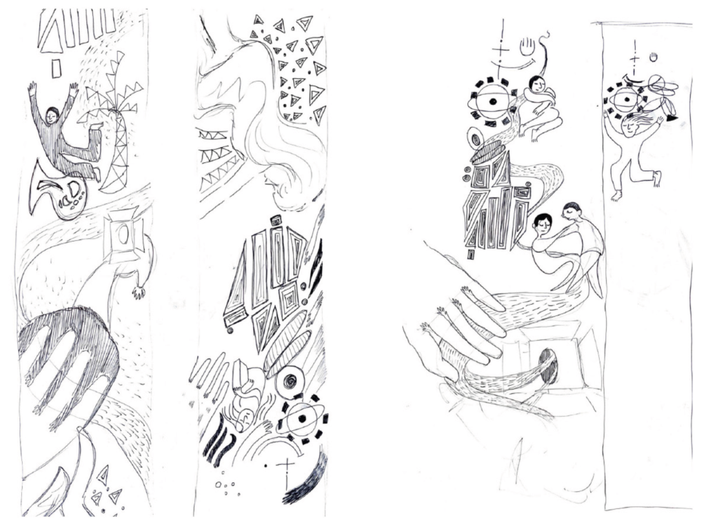 La recherche créative du binôme sélectionné pour le dessin final, Alla garder (@itoshi_alla) et Angeline Fine (@angeline8914), s’est focalisée sur les questions suivantes : comment proposer un dessin à 4 mains, et qui parle à tous les publics accueillis par le théâtre?